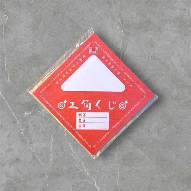 懐かしの三角くじをイメージしたメモ帳です。 ふつうのメモ帳としてもご利用いただけますが、せっかくなら…作りたいですよね!懐かしの三角くじ!ということで、作るときのポイントをご紹介します。 1.表にくじの内容や景品、裏には当たりを記入 (真ん中に小さく、薄い色のペンで書くと、透けて見えません) 2.半分に折って、糊付け ※用紙に糊は付いておりませんので、スティック糊などをご使用ください! レトロが味わえるユニークな一品。贈り物のメッセージカードとしても楽しめそうですね。くじをぺりぺりちぎった中に「特賞!」なんて書いてあったら、贈り物がより特別なものに感じられちゃうかも!? サイズ:80×80mm 容量:20枚入り