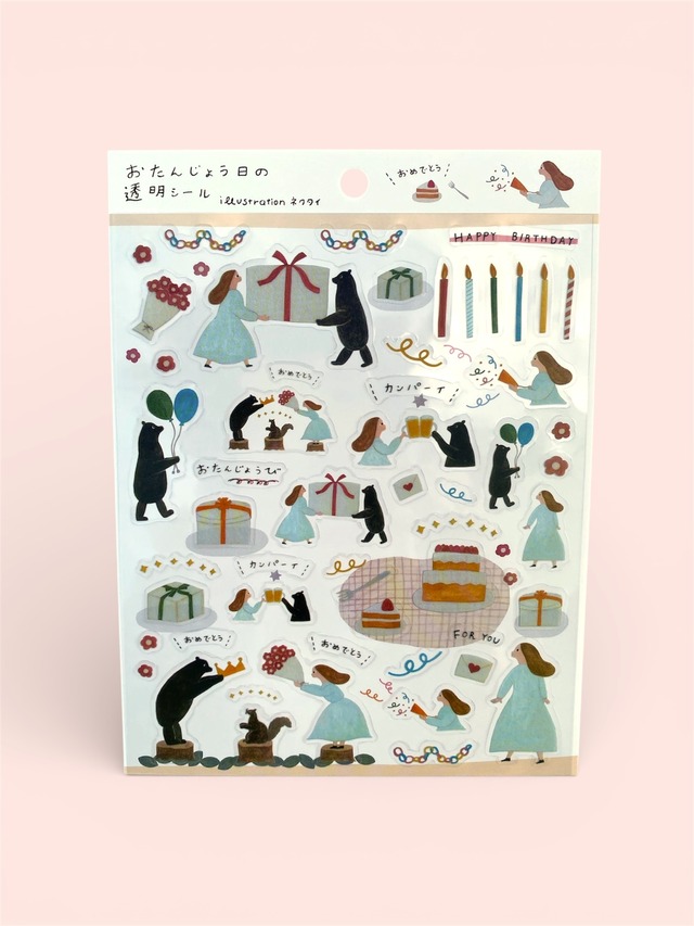 普段使いの手帳にも、特別なバースデーカードにも。いろんなところに貼りたくなる、ネクタイさんの「おたんじょう日」のシートシールです。 お誕生日を祝うくまさんと女の子が描かれた、かわいくてユーモアたっぷりなデザイン。 「おめでとう」「カンパーイ」といった文字たちもシールになっています。 シートはA5サイズのノートにちょうど挟めるサイズです。 大きめのシールは小物のワンポイントやステッカーのように、小さいシールは手帳やお手紙などに貼ってお楽しみいただけます。 余白部分は透明になっているので、手帳や小物によくなじみます。 ネクタイさんのかわいいイラストシールで、おたんじょう日をお祝いしてみませんか? 《サイズ 素材》 ・台紙サイズ:141 × 188 mm ・シールシートサイズ:138 × 170 mm ・シール素材:PET ◆ cozyca productsについて 昭和8年に設立した京都の和文具メーカー「表現社」が2013年に社内ブランドとしてcozyca productsを立ち上げ。 ・より多くの人に作家さんのデザインを楽しんでもらたい ・少しでも作家さんの活動のお手伝をしたい ・作家志望の若い人たちの少しでもの希望になれば このような思いがこめられ、若い女性作家とコラボレイトした製品を発表するブランド。 ◆ アーティスト ネクタイ / necktie 北海道を拠点にご夫婦で活動するイラストレーターユニット。 くすみのある優しい色彩で描かれた、物語性のある作品たち。この世界観は2人のお喋りから生まれていくという。 絵本や雑貨をつくり、個展の開催やイベント出店などでも活躍。自ら運営するアトリエでは作家さんの展示もおこなっている。