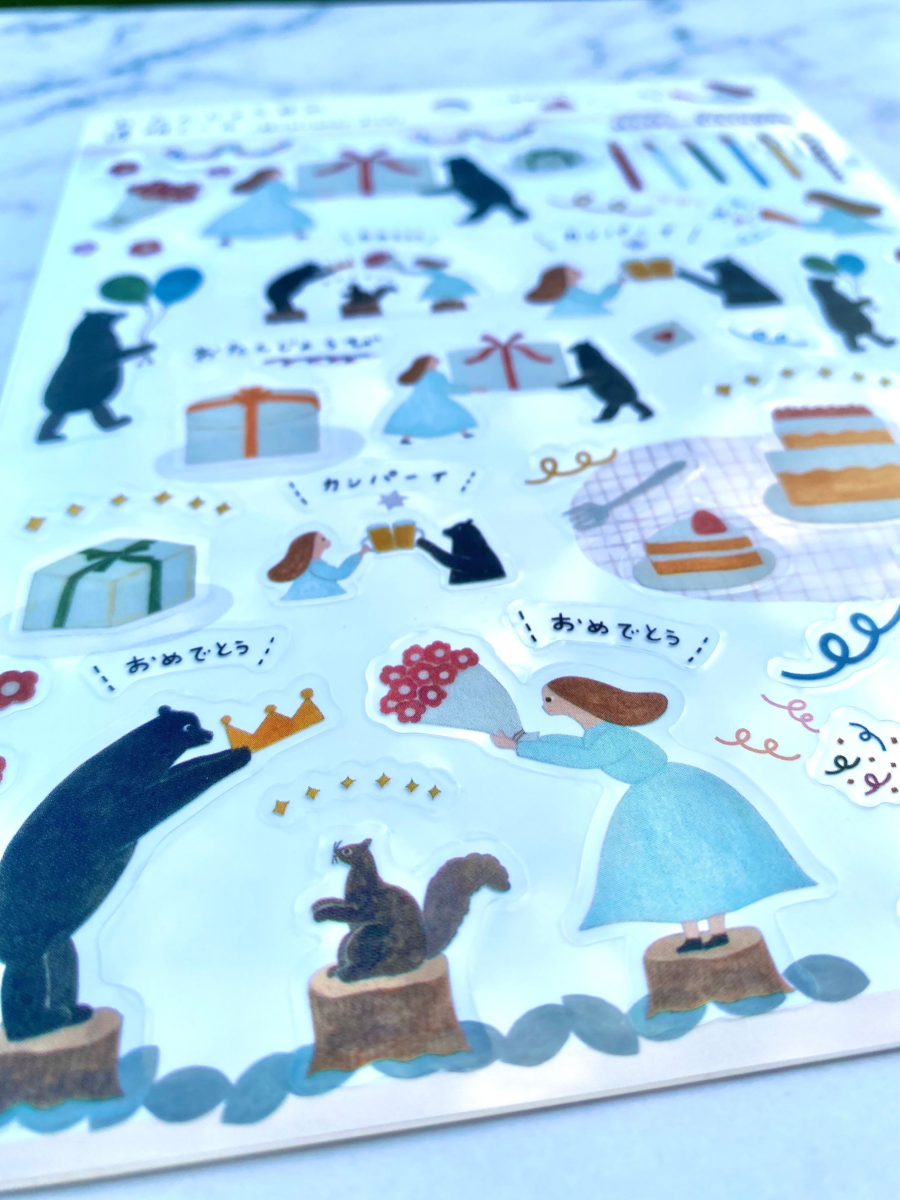 お誕生日を祝うくまさんと女の子が描かれた、かわいくてユーモアたっぷりなデザイン。 「おめでとう」「カンパーイ」といった文字たちもシールになっています。 シートはA5サイズのノートにちょうど挟めるサイズです。