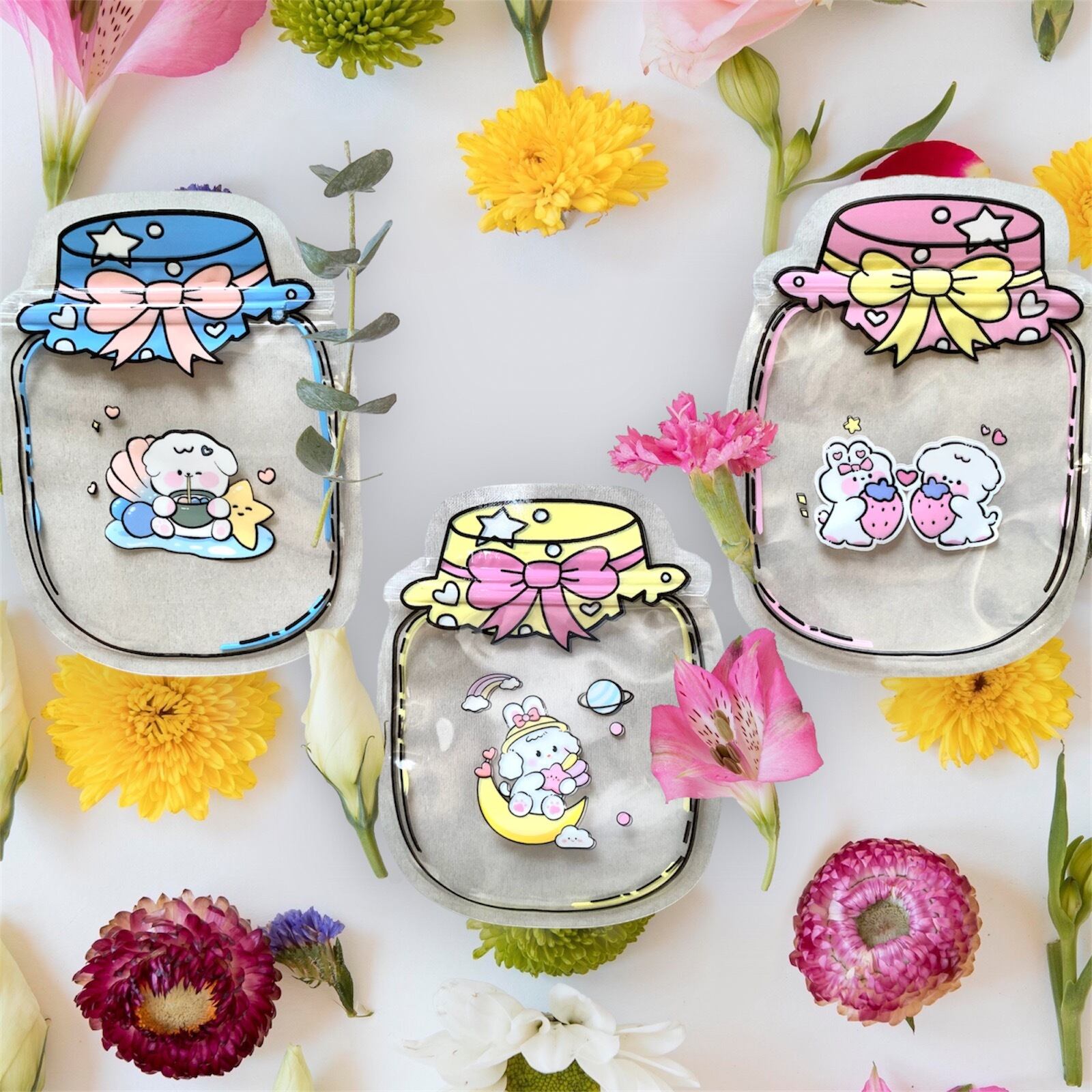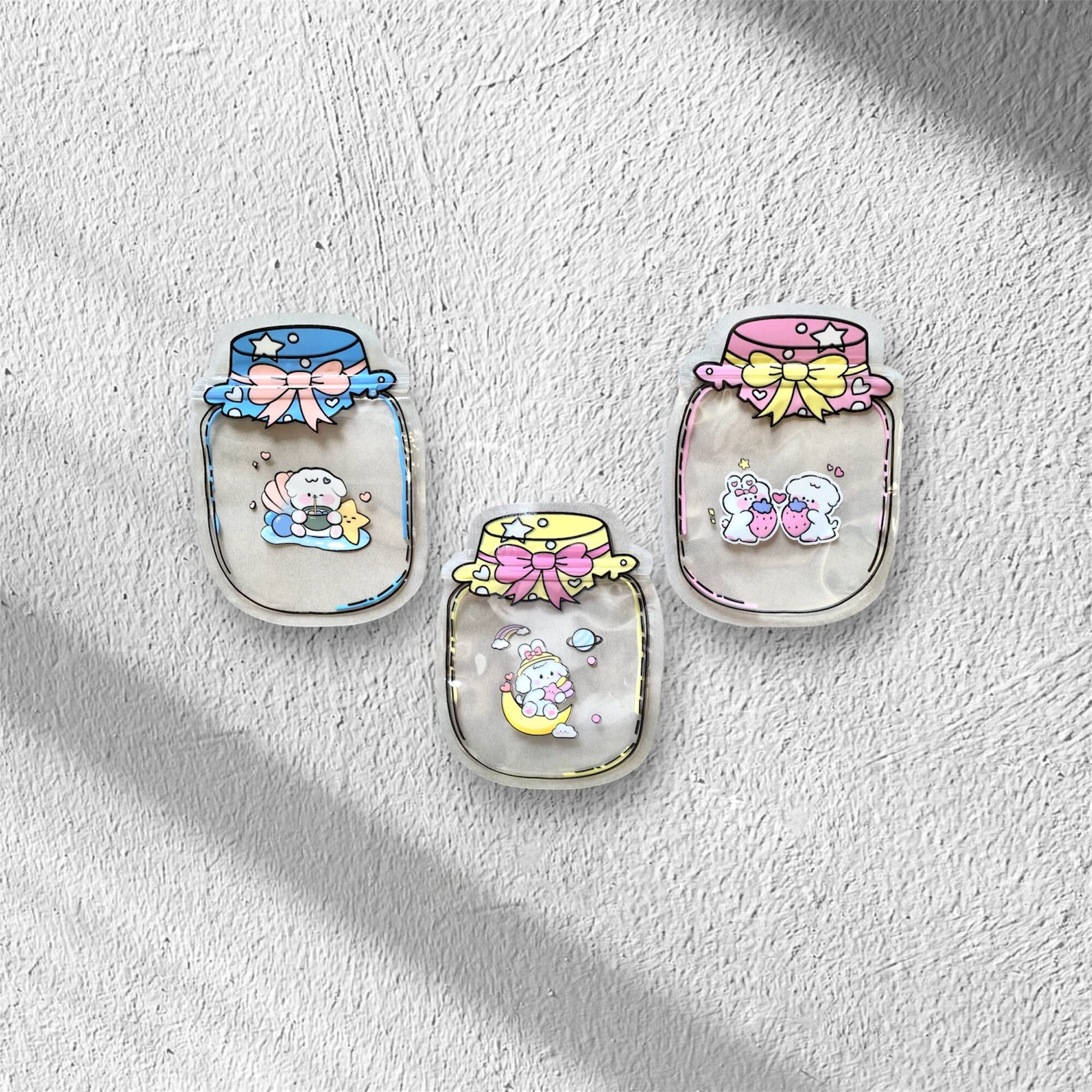 瓶のなかに、うさぎといぬがすわっている可愛いデザインです。2枚ずつ×3カラーが入った、カラフルな6枚セットです!